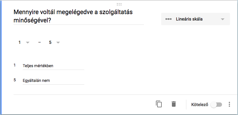 Amint ezzel megvagyunk, jöhetnek a kérdések. A kérdés típusánál kiválasztjuk a lineáris skálát és megadjuk a kérdést, majd meghatározzuk a skála hosszát. Az első és utolsó érték címkéjét (pl. egyáltalán nem, teljes mértékben) nem kötelező megadni, viszont javasolt, hiszen másképpen a válaszadó csak sejtheti, hogy mit jelentenek a válaszopciók.