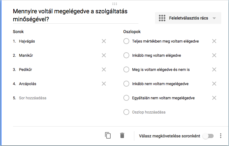 A kérdés típusánál kiválasztjuk a feleletválasztós rácsot, majd megadjuk a kérdést. A sorokhoz beírjuk a változókat az oszlopnál pedig megadjuk a skála pontjainak értékét.